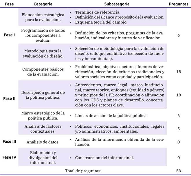 En la tabla 5, se muestra un resumen de los criterios de evaluación, indicadores y fuentes de verificación correspondientes a cada categoría y subcategoría. Estos elementos fueron elaborados para las 47 preguntas de la Fase II.