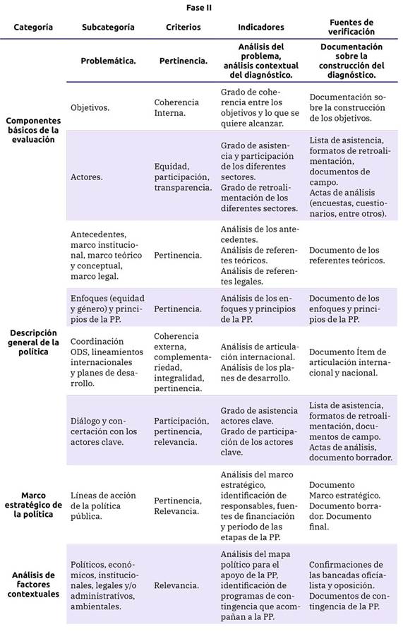 En la segunda fase se abordan 47 preguntas con sus categorías y criterios de evaluación, tales como pertinencia, coherencia interna, equidad, participación, transparencia, coherencia externa, complementariedad, integralidad y relevancia. También se incorporan los indicadores y las fuentes de verificación.