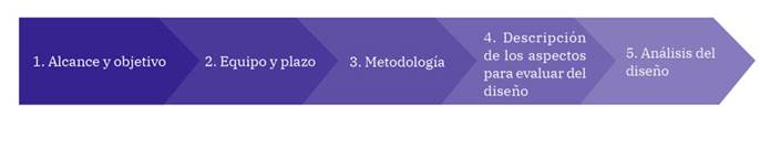 A partir de las anteriores premisas, la propuesta de evaluación de diseño para los programas públicos, el autor propone cinco elementos: i) alcance y objetivo, ii) equipo y plazo, iii) metodología, iv) descripción de los aspectos a evaluar del diseño y v) el análisis del diseño (Arenas, 2021).