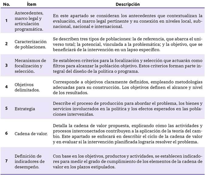 Descripción del programa o descripción de la política pública. En esta sección se describen aspectos esenciales para los evaluadores. En la tabla 1 se detallan los ítems clave.