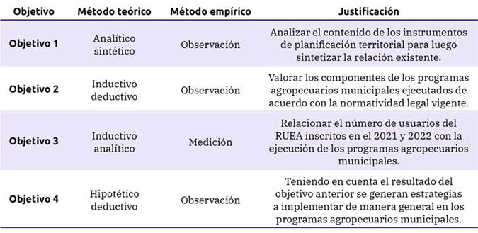 El diseño metodológico está basado en la revisión documental de tipo cualitativo que permite analizar y evaluar la articulación de los programas agropecuarios municipales ejecutados con el PDEA, el PDT y con la actividad productiva registrada en el RUEA; comparar el registro de usuarios con la implementación de los programas agropecuarios municipales de acuerdo con las líneas productivas determinadas a nivel municipal durante el periodo 2021-2022 y por último proponer estrategias y lineamientos de implementación que permitan el diseño de programas agropecuarios municipales acorde al PDEA, a la vocación económica municipal y al diagnóstico socioeconómico actual de los productores agropecuarios.