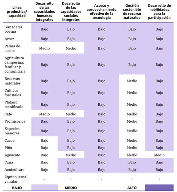 En el documento técnico de formulación del PDEA (2019) se determina que en promedio los productores del departamento de Casanare se encuentran en un nivel de clasificación bajo con respecto a las capacidades, cualidades o aptitudes que permiten el desarrollo, cumplimiento, desempeño y ejecución de una o más actividades agropecuarias. El PDEA, (2020-2023) realiza un análisis detallado de cada una de las líneas productivas priorizadas a nivel departamental como se muestra en la tabla 2.