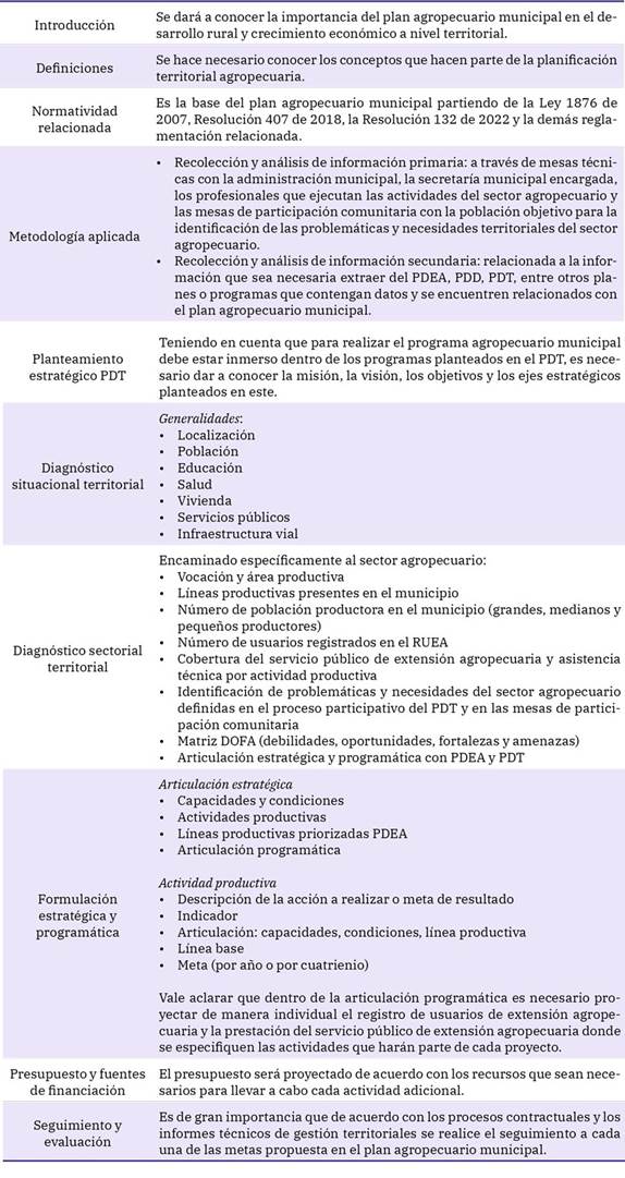 La investigación diseña, de manera detallada, los lineamientos que permiten la construcción de planes agropecuarios municipales articulando la normatividad legal vigente (Ley 1876 de 2017, Resolución 407 de 2018 y Resolución 132 de 2022), la programación estratégica de los instrumentos de planeación, las necesidades y problemáticas identificadas por las comunidades quienes se convierten en la población objetivo a beneficiar con el diseño e implementación de estos planes.