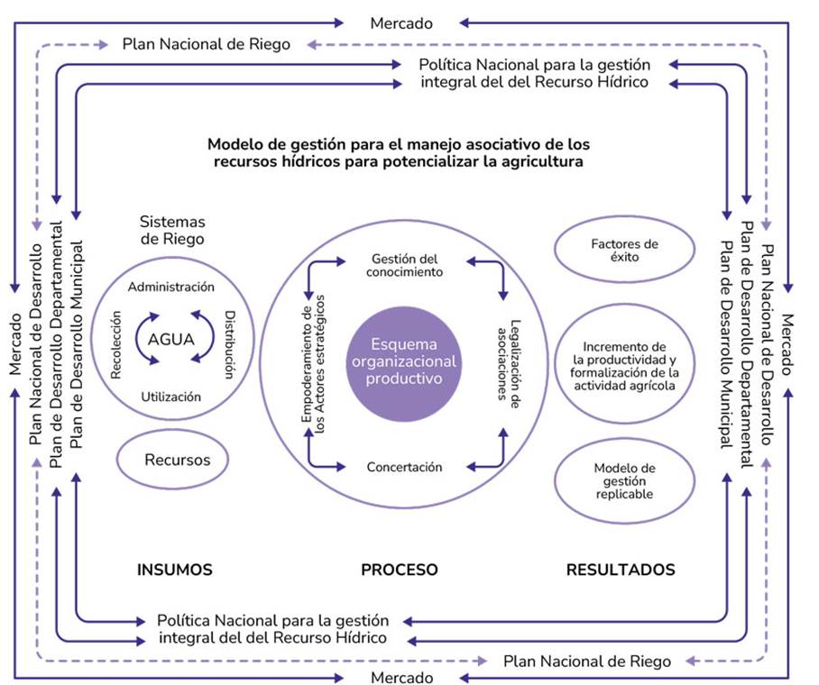 Un modelo asociativo de gestión es fundamental para mejorar el acceso a los recursos naturales, especialmente el agua, y para aumentar la productividad del territorio agrícola, basándose en sus potencialidades y características comunes. Un manejo asociativo del agua resulta imprescindible para el fortalecimiento de las áreas rurales que mantienen una dinámica de producción de subsistencia, ya que sus posibilidades de mantenerse y desarrollarse de forma independiente son limitadas. De acuerdo con lo anterior, el modelo busca desarrollar asociaciones que formen parte del sector social o comunitario de la entidad territorial a la que pertenecen, canalizando recursos provenientes de las autoridades nacionales, departamentales y municipales.
