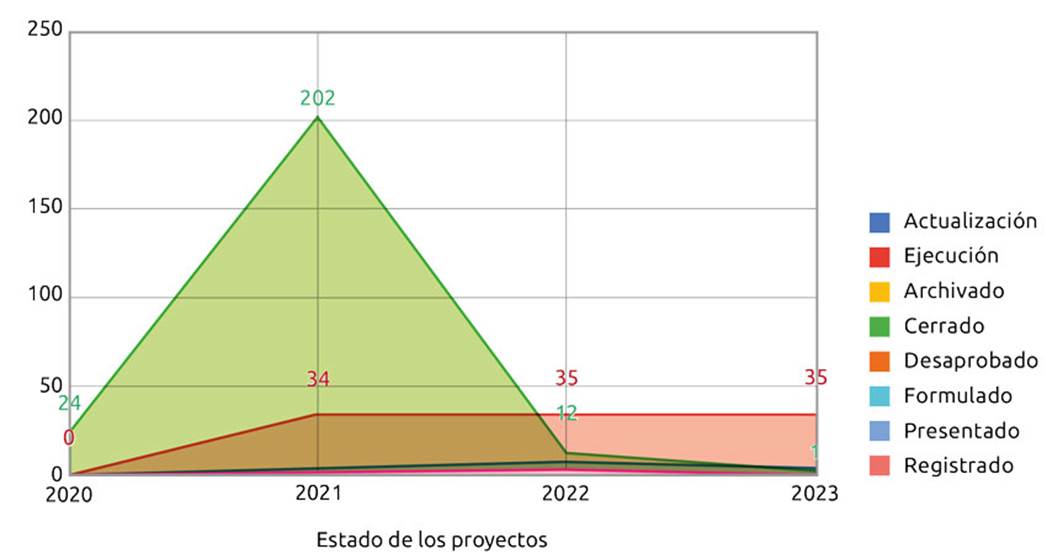 Con base en el informe proporcionado por la Alcaldía de Acevedo, que abarca la ejecución de proyectos entre 2020 y 2023, se formularon un total de 366 proyectos. La distribución por año fue la siguiente: 24 proyectos en 2020, 242 en 2021, 56 en 2022, y 44 en 2023. De estos, el 65% han sido finalizados, el 28% se encuentran registrados, el 3.27% están en actualización, el 1.09% en ejecución, el 0.54% han sido desaprobados o archivados, y solo el 0.27% han sido presentados para su evaluación.
