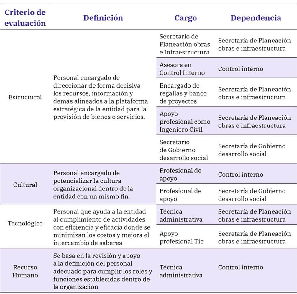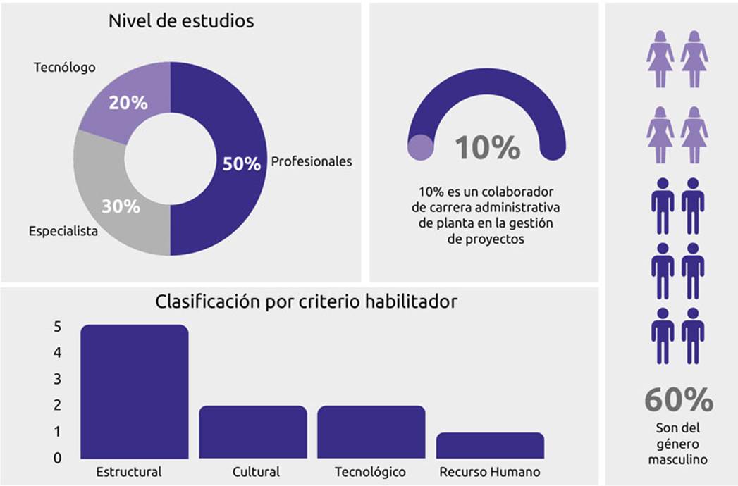 Siguiendo los lineamientos del PMI, se clasificaron los facilitadores en cuatro categorías: estructural, cultural, tecnológico y recurso humano, según sus roles y funciones dentro de la organización. Esta clasificación muestra cómo se distribuyen las responsabilidades dentro de la entidad (tabla 3).