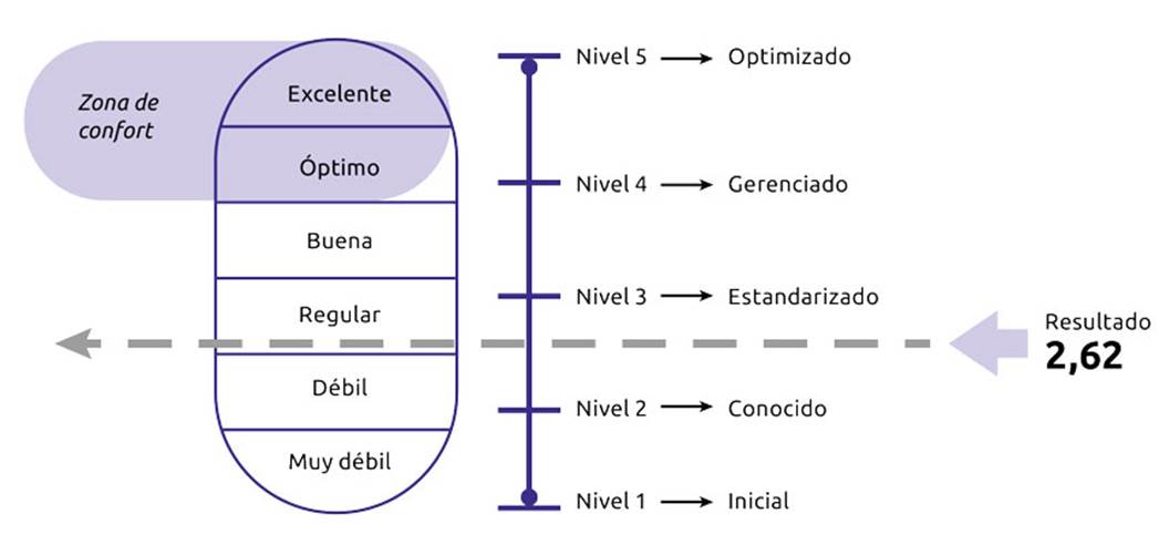 Como resultado del análisis realizado, se determinó que la Alcaldía de Acevedo tiene un nivel de madurez de 2,62, lo que la coloca como una entidad con una gestión regular en proyectos. Según las características generales de este nivel y los resultados detallados de la evaluación, se puede afirmar que existe un conocimiento general sobre la gestión de proyectos, se llevan a cabo iniciativas aisladas y se utilizan algunas herramientas para organizar, sistematizar y compartir información (figura 4).