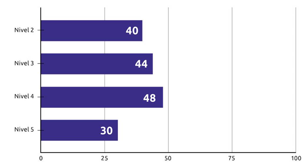 Al desagregar en detalle el resultado de madurez obtenido respecto a la adherencia de la entidad en los niveles esperados, se observa que las mejores puntuaciones se obtienen en los niveles tres y cuatro. Con base en esto, se puede deducir que la alcaldía implementa buenas prácticas para la gestión de proyectos. Sin embargo, se percibe una falta de esfuerzos por parte de la gerencia en el fortalecimiento del talento humano. Además, se observa que para los niveles dos, tres y cuatro, la adherencia está entre el 40% y el 48%, lo que indica una alineación entre los conocimientos y la experiencia práctica en la gestión de proyectos (figura 5).