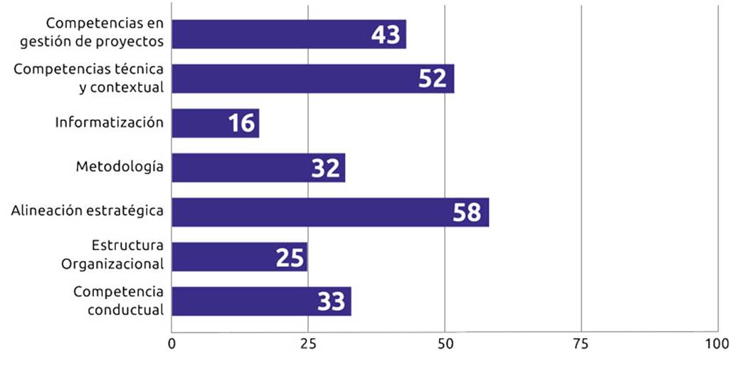 En cuanto a la adherencia por dimensiones en la alcaldía, se obtuvieron las mejores puntuaciones en las dimensiones de alineación estratégica y competencias técnica y conductual, lo cual es esperado, considerando que la organización es de carácter público, y por lo tanto, requiere una alineación estratégica con los planes de desarrollo y objetivos de desarrollo sostenible con la formulación de proyectos. De igual forma, los facilitadores y habilitadores cuentan con más de cinco años de experiencia en proyectos públicos y sus profesiones están relacionadas con los roles y el entorno.