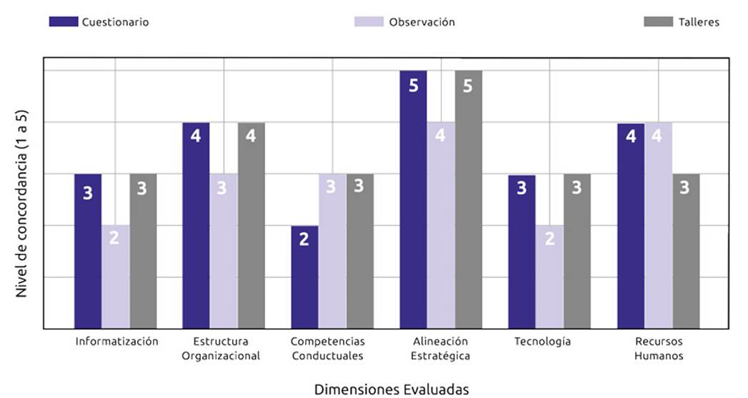 Finalmente, la combinación de los enfoques cuantitativo y cualitativo permitió realizar una triangulación de datos, donde los resultados del cuestionario de madurez se complementaron con los hallazgos cualitativos obtenidos de la observación directa y los talleres participativos. Esta triangulación enriqueció el análisis y facilitó la elaboración de un plan de acción más robusto, alineado con las necesidades identificadas en la organización.