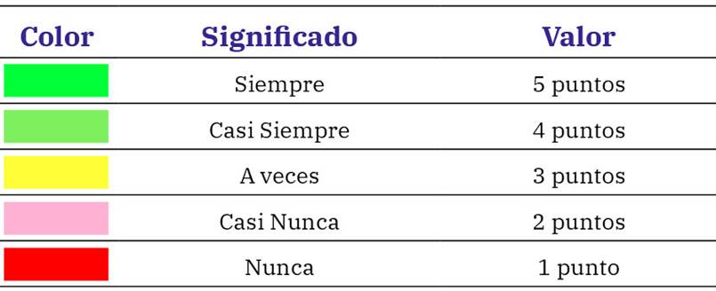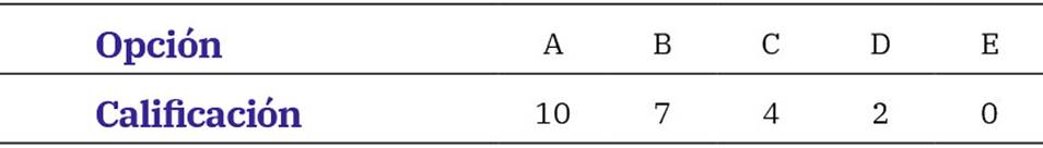 Las preguntas se presentan con cinco opciones de respuesta, a excepción del nivel 5, que ofrece solo ofrece dos opciones. La calificación de las respuestas sigue una escala previamente definida, como se muestra en la tabla 1, con puntuaciones que van desde 0 hasta 10:
