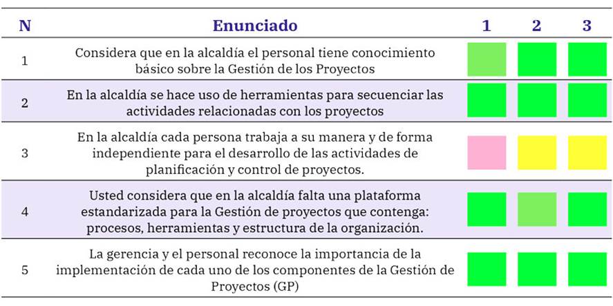 En esta fase, se seleccionaron como expertos a los líderes de cada uno de los equipos responsables de facilitar y habilitar la gestión de proyectos en la organización. Estos incluyen un líder de la Secretaría de Planeación, Obras e Infraestructura, un líder de la Oficina de Control Interno, y un líder del Banco de Proyectos. Una vez identificados, se planteó el problema a estudiar, el cual se descompuso en cinco componentes clave que serán objeto de debate. Cada experto proporcionó su opinión de manera individual, utilizando una escala de colores que permite visualizar el grado de consenso sobre cada componente, tanto desde una perspectiva histórica como futura.