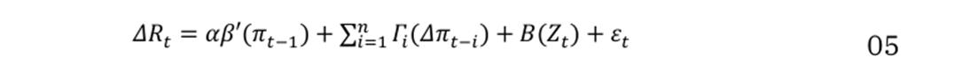 Ahora bien, el modelo macroeconométrico estimado en esta investigación mantiene la misma especificación que la prueba de cointegración de Johansen. El modelo VEC correspondiente es el siguiente: