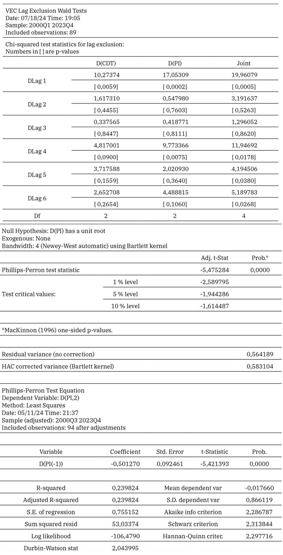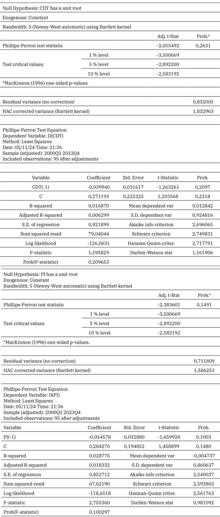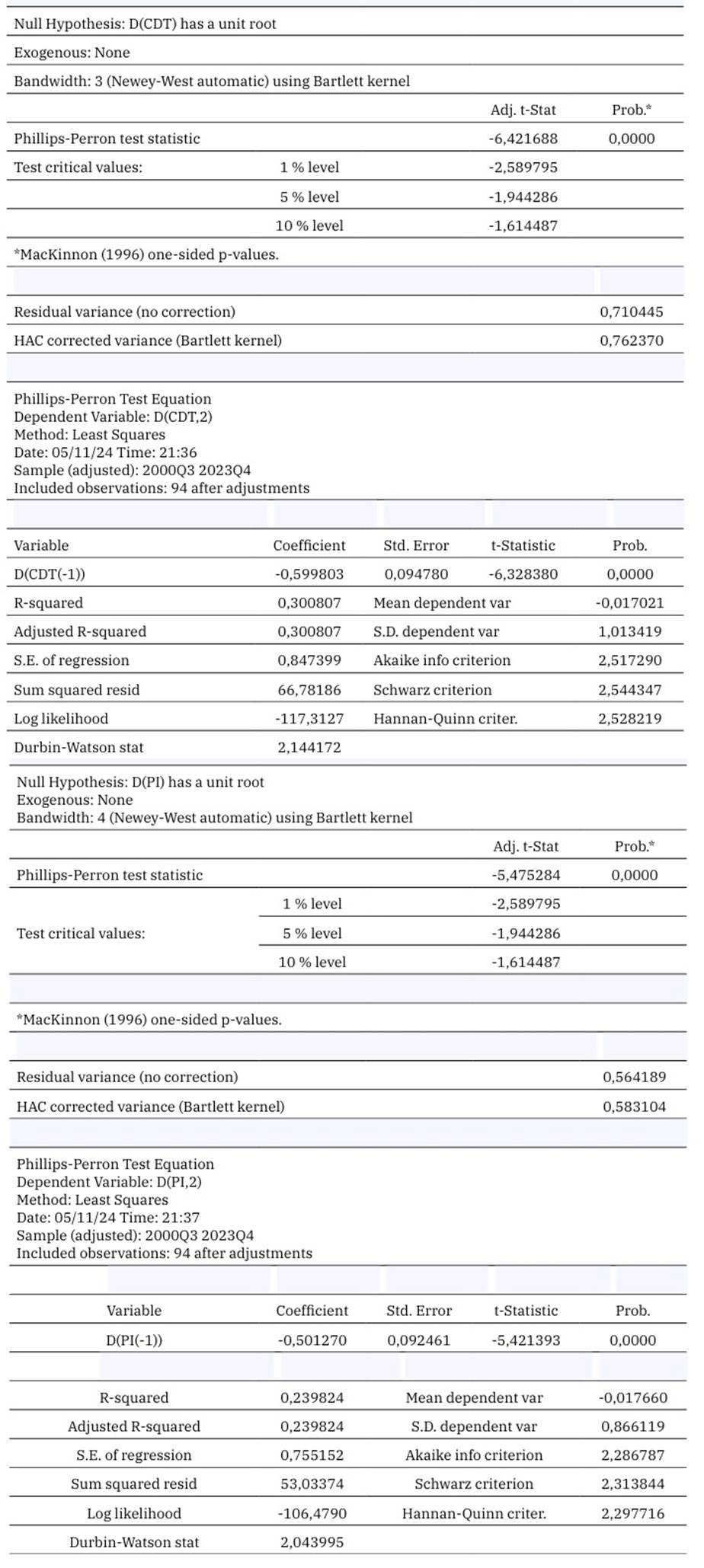 A la hora de estimar modelos de series temporales multivariantes, es esencial verificar una serie de supuestos mediante pruebas estadísticas para garantizar su robustez (ver Apéndices). En primer lugar, debe determinarse el orden de integración de las variables, crucial para especificar si las variables deben estimarse en niveles con intercepto o tendencia, en primera o segunda diferencia. En esta investigación, dado que se estima un modelo VEC, las variables deben tener raíz unitaria en sus niveles; sin embargo, no deben tenerla en las primeras diferencias. En consecuencia, utilizamos la prueba de Phillips-Perron4 para confirmar que no son estacionarias en niveles, pero que sí lo sean cuando se considera la primera diferencia.