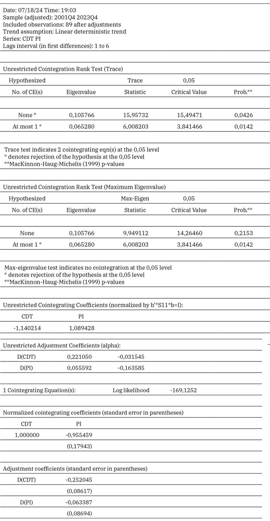 Primero, tras establecer que cada una de las variables en esta investigación cumple con un orden de integración y confirmar la existencia de una relación de cointegración, se identifica un vector de cointegración, lo que sugiere un equilibrio a largo plazo (1, -0,95). Esto permite utilizar la función de equilibrio de largo plazo para evaluar si el efecto Fisher sigue siendo válido y determinar si se puede considerar completo, parcial o inexistente en la economía colombiana durante el periodo de 2001 a 2023.