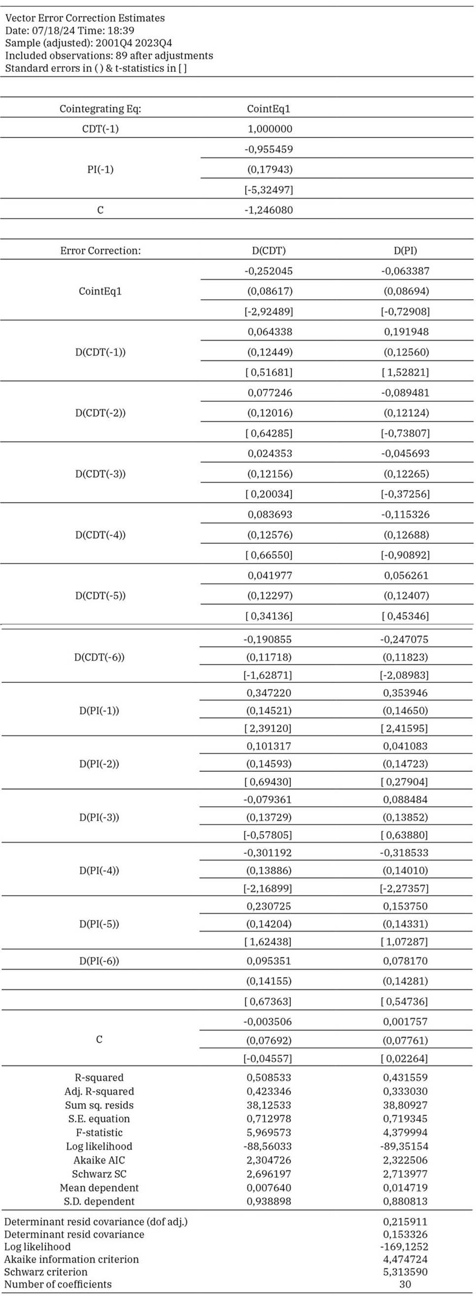 Donde 0,252 representa la velocidad de ajuste, que es estadísticamente significativa. Un valor más cercano a cero indica que el equilibrio a largo plazo se alcanza más rápidamente. A su vez, como se mencionó anteriormente, los residuales del modelo VEC estimado, como resultado, tienen un orden de integración cero en el largo plazo , indicador de que la relación de cointegración no tiene raíz unitaria, lo que implica que las series están cointegradas a largo plazo. Por lo tanto, la ecuación (5) se considera una especificación adecuada para evaluar si el efecto Fisher sigue siendo válido, y determinar si su impacto es completo, parcial o inexistente en la economía colombiana.