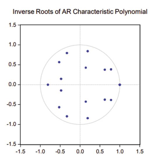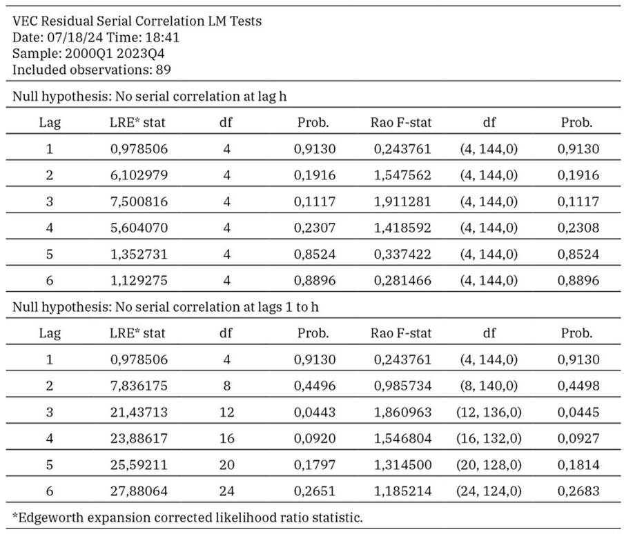 Posteriormente, se verifica la estabilidad dinámica del modelo, asegurando que las variables vuelven a sus niveles de equilibrio dinámico a largo plazo, tras identificar variaciones en el vector de innovaciones. En nuestra investigación, estimamos las raíces inversas del polinomio autorregresivo8 para confirmar la estabilidad del modelo VEC, concluyendo que la estimación es estable. A continuación, se revisan dos supuestos adicionales del modelo VEC: en primer lugar, evaluamos si la varianza de los residuos es constante utilizando la prueba de heteroscedasticidad de White sin términos cruzados9, concluyendo que los residuos son homocedásticos; en segundo lugar, se verifica la ausencia de correlación serial mediante la prueba del multiplicador de Lagrange10, confirmando que no existe autocorrelación entre los rezagos aplicados en el modelo.
