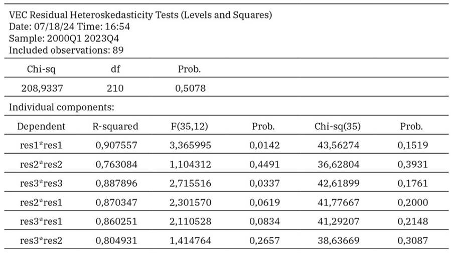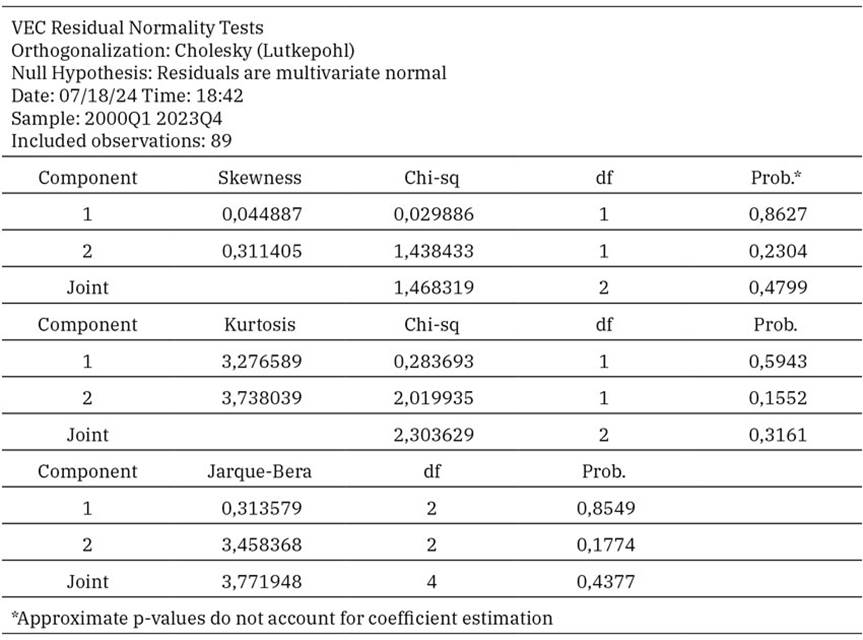 Por último, se realizó la prueba de normalidad11 de los residuos del modelo, que evalúa la distribución asintótica de los residuos en el modelo VEC estimado. Este paso se basa en la premisa de cumplir con los supuestos de errores no correlacionados y homocedasticidad, como sugiere Johansen (1995), quien señala la importancia de verificar que los residuos no se desvíen significativamente del supuesto de ruido blanco. Para cumplir este supuesto, en esta investigación se realiza una revisión detallada de los valores atípicos en los residuos del modelo VEC para crear las variables dicotómicas de normalidad exógena que se incluyen en el modelo. Asimismo, se realiza la prueba para confirmar el cumplimiento de este supuesto y validar la normalidad de los residuos.